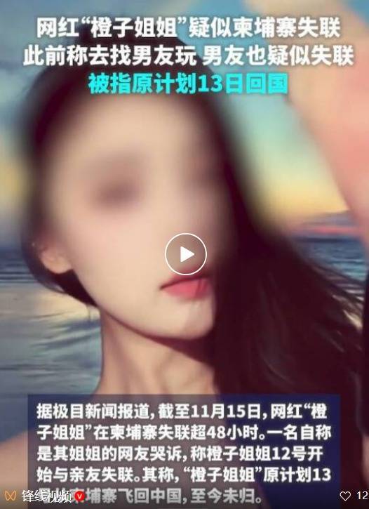 此前据多家媒体报道,在网络上拥有十多万粉丝的网红“橙子姐姐”16日被曝在柬埔寨失联超48小时,其姐姐哭诉她12日开始与亲友失联,并称“橙子姐姐”原计划13日从柬埔寨飞回中国,但至今未归。